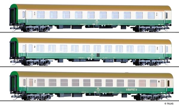 Reisezugwagenset der DR, bestehend aus einem Reisezugwagen 1. Klasse, Bauart Halberstadt, einem Reisezugwagen 1./2. Klasse, Bauart Halberstadt, und einem Reisezugwagen 2. Klasse mit Buffetabteil, Bauart Halberstadt