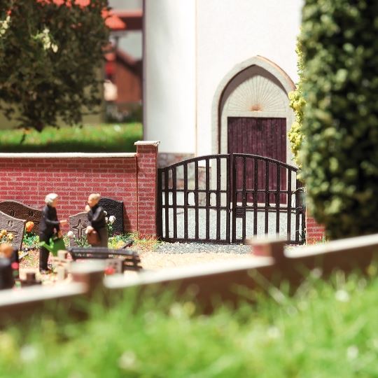 Mit filigranem Gittertor aus Echtholz und stabilen Mauerelementen sowie Säulen aus gelasertem Grafikkarton.