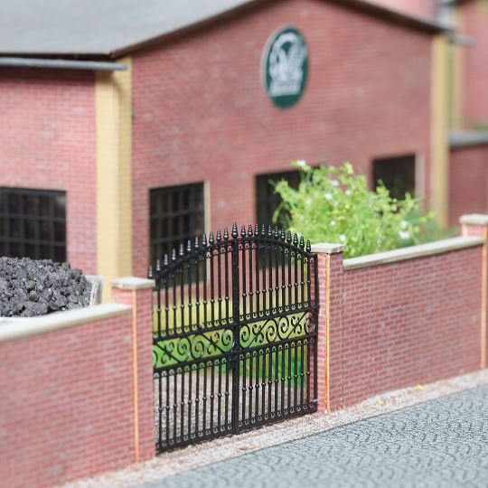 Super-realistische Ziegelmauer zur Einfriedung von privaten und öffentlichen Anlagen und Plätzen. Mit filigranem Tor (Kunststoff) und stabilen Mauerelementen sowie Säulen aus gelasertem Grafikkarton.