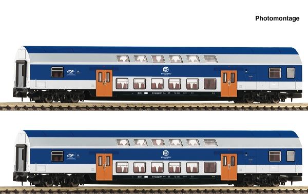 Wagenset mit zwei Doppelstockwagen, Gattung DBmue, des VEB Waggonbau Görlitz.