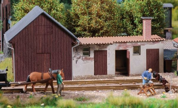 Vielseitig kombinierbar mit bereits bestehenden Gebäuden sind der Holzschuppen mit Satteldach und das etwas baufällige Nebengebäude mit stark verwittertem Putz. Die beiden Gebäude können beliebig, auch einzeln, gestellt werden.